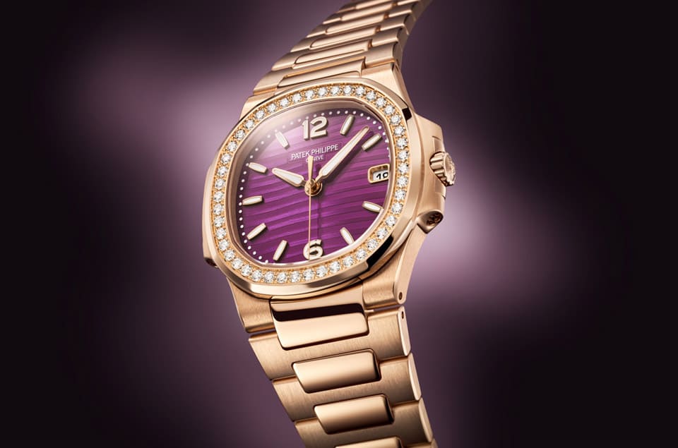 ▲百達翡麗停產數款石英金鷹女錶,新推出採用玫瑰金材質與紫色面盤的新款。