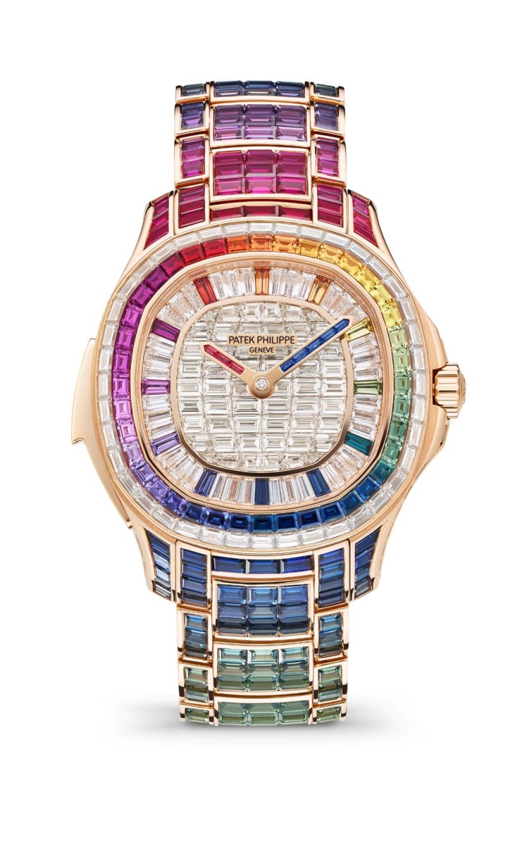 ▲5260/1455R-001整只錶鑲有將近800顆彩色藍寶石,將彩虹圈的定義再延伸。