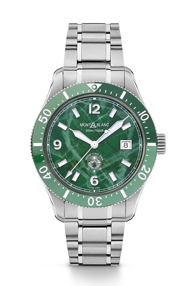 錶款採用不鏽鋼材質,錶殼41mm是現今運動錶的主流尺寸,此外品牌還替手錶配置了綠色的陶瓷圈,另外翻到錶背會看到上頭有立體浮雕冰山與正在探索下方冰河水域的潛水者圖案,光是鐫刻這個圖案的工法就是一道難題,然而當品牌克服技術限制後,呈現在手錶上的成果大家有目共睹。1858系列Iced Sea日期顯示自動錶搭配與錶圈相同顏色的面盤,而且萬寶龍選擇顏色時並非只是選些熱門色,而是在其中寄寓一些和系列精神呼應的元素,例如綠色就是代表南極洲冰川映現雪藻的顏色,若只是單純的綠色你可能會覺得這樣的配色靈感可能有點牽強,但是這系列潛水錶吸引人的地方就在於它有高辨識度的面盤裝飾。