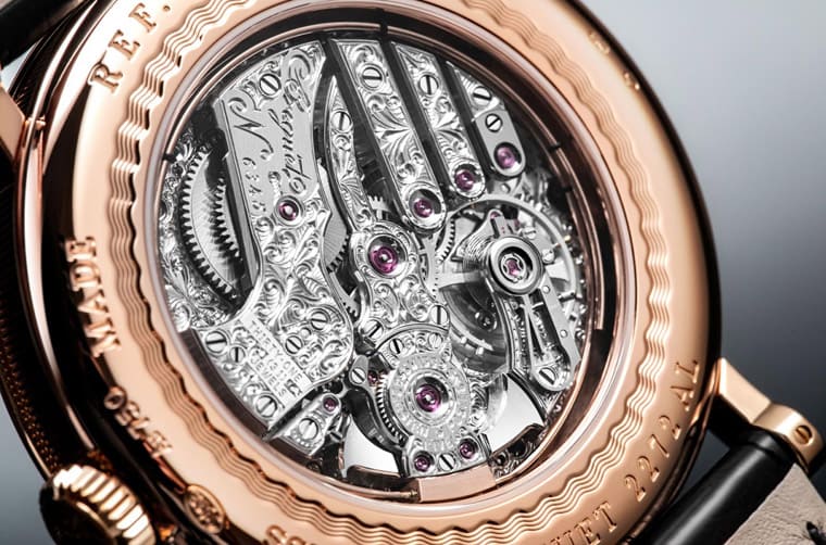 錶背重頭戲就是手錶搭載的567/2手上鍊機芯,雖然它的正面相對優雅樸實,可是寶璣針對這枚機芯下的功夫沒有因此而減少,於是我們可以看到機芯的底板上充滿了手工製作的雕刻花紋,包括擺輪橋板的狹小空間一樣有雕花裝飾,加上夾板上也有魚鱗紋打磨,光用看的就可以感受到寶璣製作這枚機芯花費許多時間和精神。機芯背面還能欣賞到三問報時組件如音錘與音簧,前者以不鏽鋼製成並經過黑色拋光處理,後者則是用K金材質製作,目的是與錶殼材質產生更佳的傳聲與共鳴效果,藉以奏鳴出清澈響亮的報時樂音。機芯的擺輪震頻為2.5Hz,動力儲存為40小時,這方面就顯得較具「古典」味,但是就手錶擁有的功能性、機芯的觀賞性等層面而言,實在也很難要求它更多了。