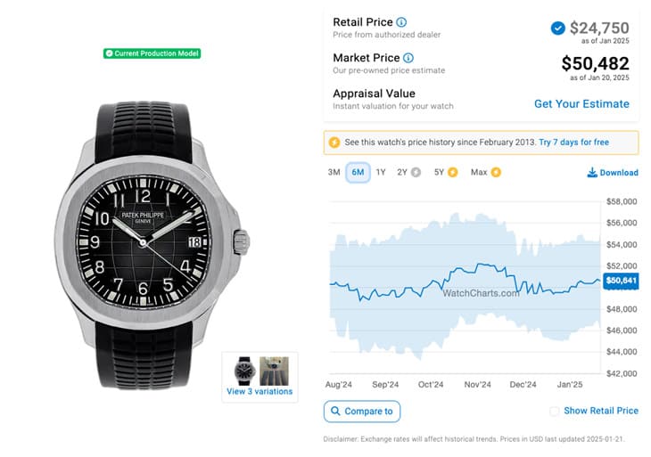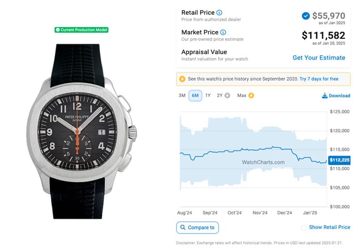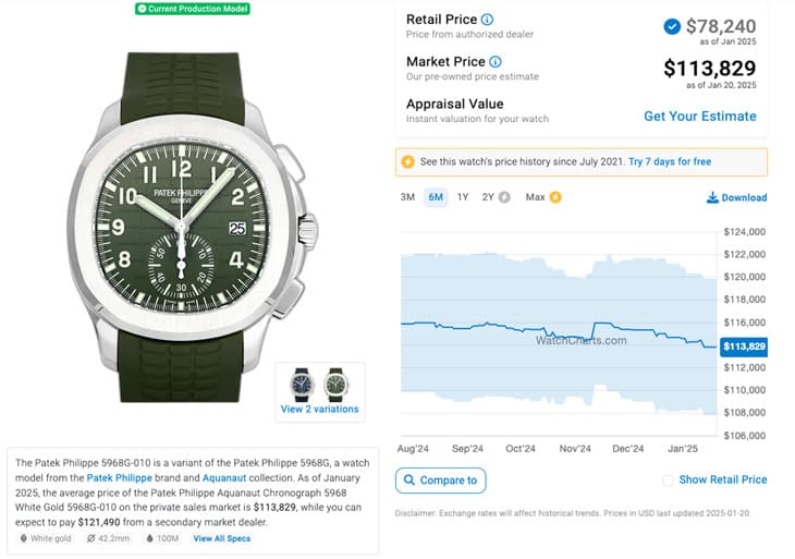 从那时起到现在又过了半年,同样从WatchCharts公布的资料中我们发现Aquanaut系列这些人气作品的行情曲线多半还是继续往下走,虽然半年来手表的行情总是会有些起伏,可是以最新的市场报价而言,与半年前的行情一比,这六款多数都呈现缩水状态。