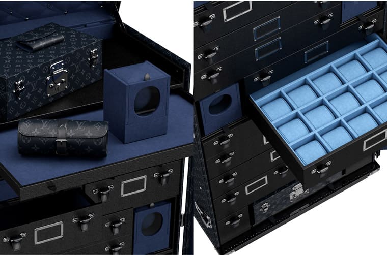 Malle Horlogere外觀覆以Monogram Eclipse帆布,展示人員一一解開扣鎖後,先把上面的箱蓋掀開,接著再打開側邊的箱門,這時就揭開了收藏櫃裡面的祕密,裡面有許多自動上鍊盒、存放手錶的抽屜,有些抽屜打開來放著Monogram Eclipse帆布的隨身錶盒,有的則是藍色襯裡的手錶收納區,抽屜中的藍色襯裡分成淺到深三種藍色,有些收納區可以把手錶攤平擺放、有的是要扣上錶扣配合錶枕收納,也有的是沒有細部夾層而是一整區的空間,完全滿足收藏家各種收納需求。