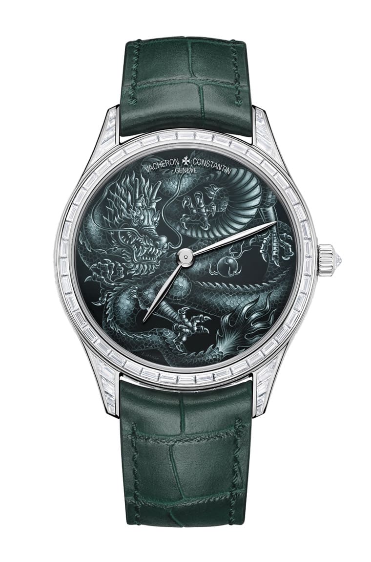 錶圈、錶殼中層和錶耳滿鑲146顆長階梯形切割鑽石,錶冠則點綴以一顆明亮式切割鑽石。面盤部分可見江詩丹頓旗下工藝師首次以綠調灰階琺瑯工藝描繪出象徵帝王威勢的五爪巨龍以及火珠。這款獲得日內瓦印記認證的獨一無二臻品時計搭載品牌著名的1120自動機芯,錶殼的纖薄程度直接源自厚度僅2.45mm的超薄機芯,在透明底蓋下機芯別具機械美感的結構能夠一覽無遺。