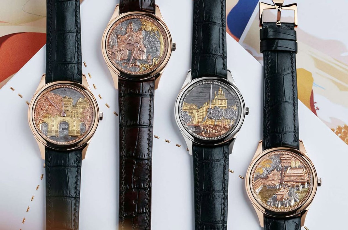 這款作品還能進一步分成4只錶,它們明顯也是圍繞”Récits de Voyages”主題而生,品牌透過這款作品突顯歐亞兩地凝聚於歷史時空的深厚淵源,以及江詩丹頓積極探索、開拓的旅行精神。此系列中有三款作品以玫瑰金打造、一款則是白金製作,錶徑為正裝錶標準的40mm規格。品牌旗下手工雕刻大師於四款手錶的面盤上生動刻畫吳哥城遺址、圓明園、北京孔廟和國子監,以及江詩丹頓19世紀時期的日內瓦總部(白金款),而且面盤圖案的靈感都是來自19世紀的畫作,這個時間點剛好就是江詩丹頓與中國的結緣之時。面盤圖案需以微雕及手工雕刻工藝在六~九塊厚度不足1毫米的黃金、白金與玫瑰金薄片上勾勒出動人圖景,隨後將薄片巧妙組合,或以不同的金質色調打造出構圖,或通過層疊覆蓋烘托帶有浮雕般的縱深效果。