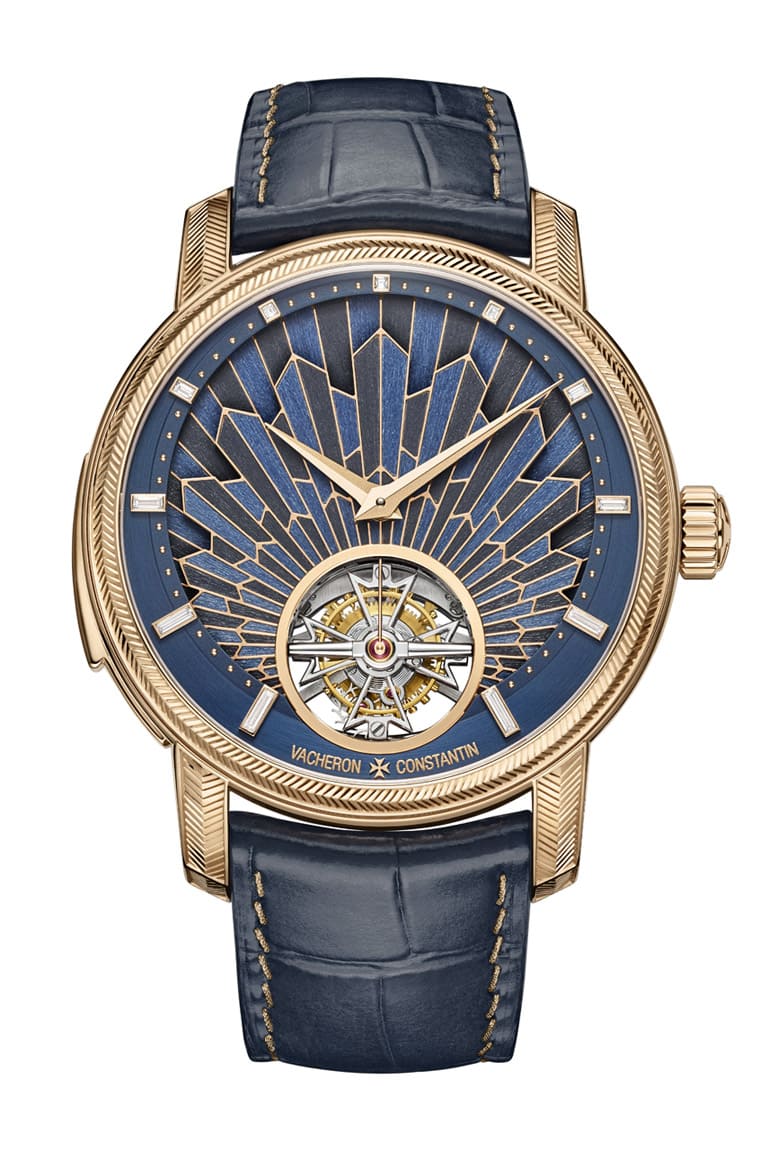 18K玫瑰金材質/2755 TMR手動上鍊機芯/時、分、小秒顯示/三問功能/陀飛輪裝置/錶背動力儲存顯示/藍色和黑色細木鑲嵌面盤/面盤鑲鑽11顆,約重0.1克拉/藍寶石水晶鏡面、透明底蓋/錶徑44mm/限量1只