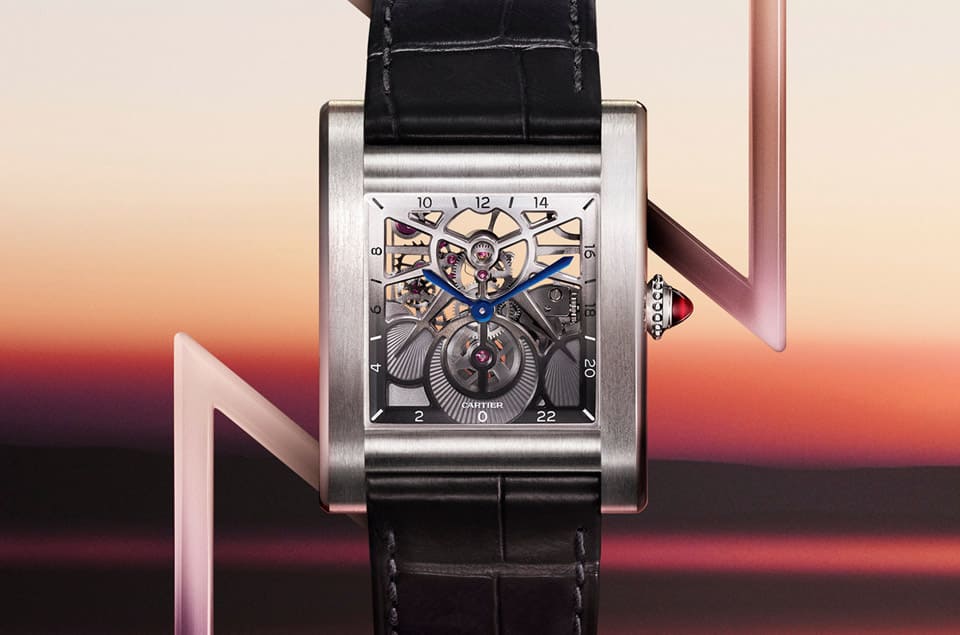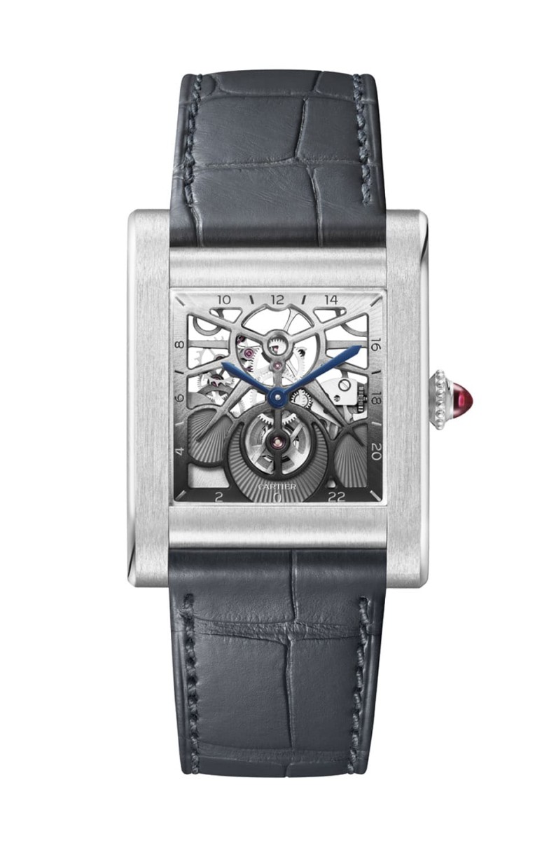 ▲新生的Tank Normale腕錶有一款鏤空版本,品牌特別將鏤空橋板分為上淺下深的色調,搭配24小時指針讓人一目了然晝夜變化。