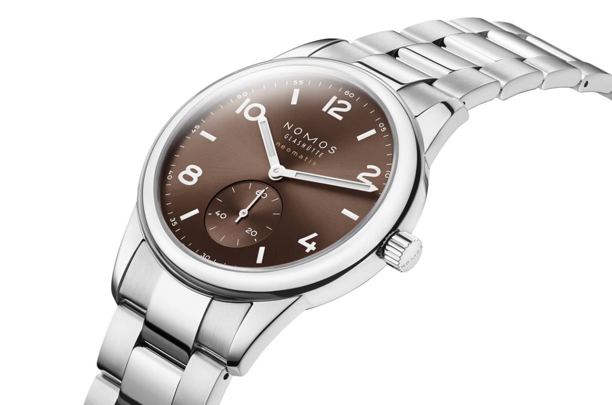 NOMOS替Club Sport neomatik 39分別搭配塔巴克色(Tabac)、微光色(Ember),以及煙燻色(Smoke)等三種面盤顏色,與品牌先曾推出的兩種尺寸皆未重複,三種電鍍至金屬面盤上的顏色都經過日暉紋處理,使其富有光澤深淺變化。Tabac色類似深棕色,乍看低調不起眼,可是隨著手腕活動或光線照射,它有別於常見的白、黑標準色依舊顯得存在感強烈;而Ember的色調與一些暖色系的金屬如黃金、青銅有異曲同工之感,搭配在不鏽鋼錶殼之內使其更能被突顯,展現出成熟率性的男士品格;最後一款Smoke的顏色呈現淺灰色調,它不是最搶眼的顏色,卻是最能襯托各種顏色或穿搭風格的萬用型配色。三種顏色的Club Sport neomatik 39於指針以及時標都覆上白色的Superluminova夜光塗層,在光線充足時與面盤顏色具有鮮明對比容易辨識,而在黑暗環境中,Superluminova夜光塗層又會發出藍色光芒,讓人能隨時掌握當前時間動態。面盤的6點方向設有向內凹陷、具有同心圓紋修飾的小秒盤,其與面盤的高低層次強化了視覺立體感,展現運動錶少見的細膩度。