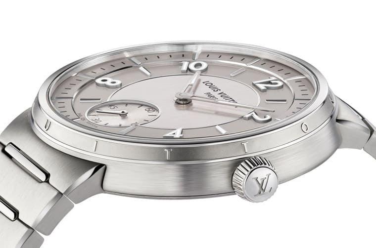 Tambour的錶殼厚度雖然降低不少,但是它的鼓狀造型還是依舊,比起以前顯得較為收斂,而在錶圈側面部分,路易威登同樣點綴了代表品牌的”L-O-U-I-S-V-U-I-T-T-O-N”等12個字母,錶圈的高度隨著錶殼厚度降低而跟著下修,所以12個字母會更貼近錶圈上下緣,而且品牌改用陽刻方式使得字母浮凸於錶圈側面。光是錶側部分還能注意到LV字母和錶圈上下都經過拋光處理,字母那整圈則採噴砂修飾,到了下面一層的錶殼部分又是使用拉絲加以裝飾。不只如此,新一代Tambour取消了傳統的錶耳結構,讓鍊帶直接從錶殼「伸」出來,鍊帶呈現由寬到窄的收束效果,而錬節表面主要是採拉絲處理,不過連接錬節的水平金屬零件則又經過拋光修飾,講究的細節完全就是高級製錶才有的風範。