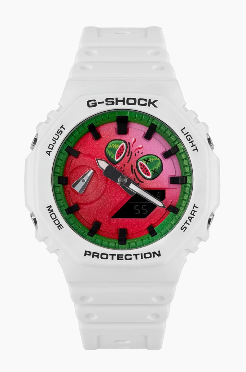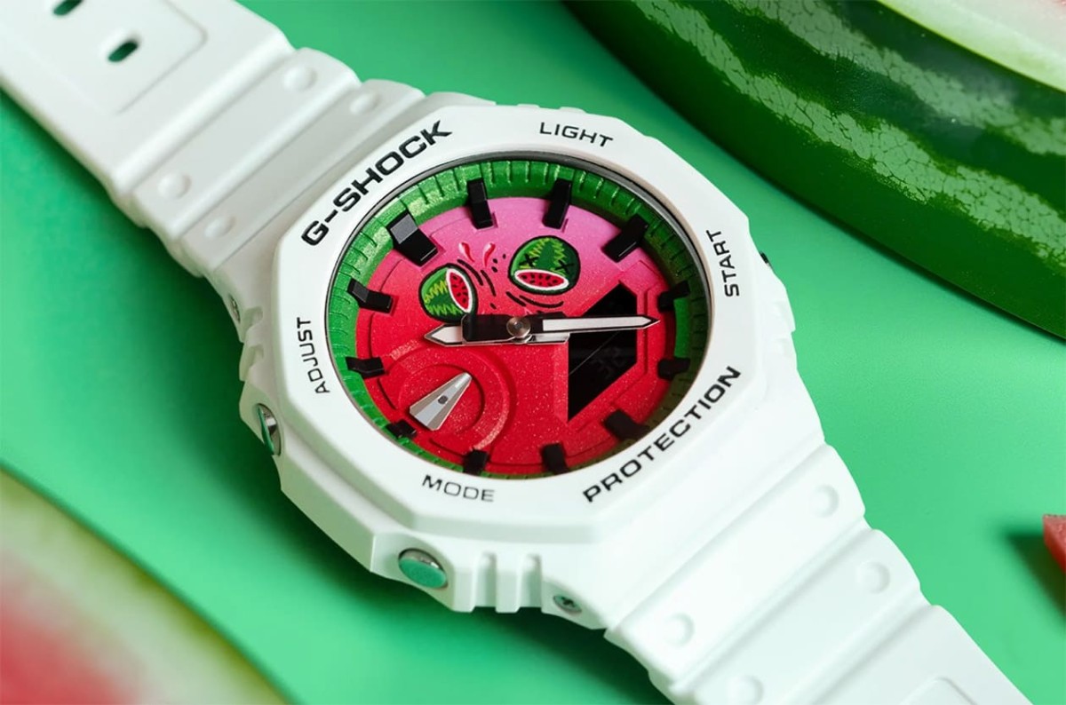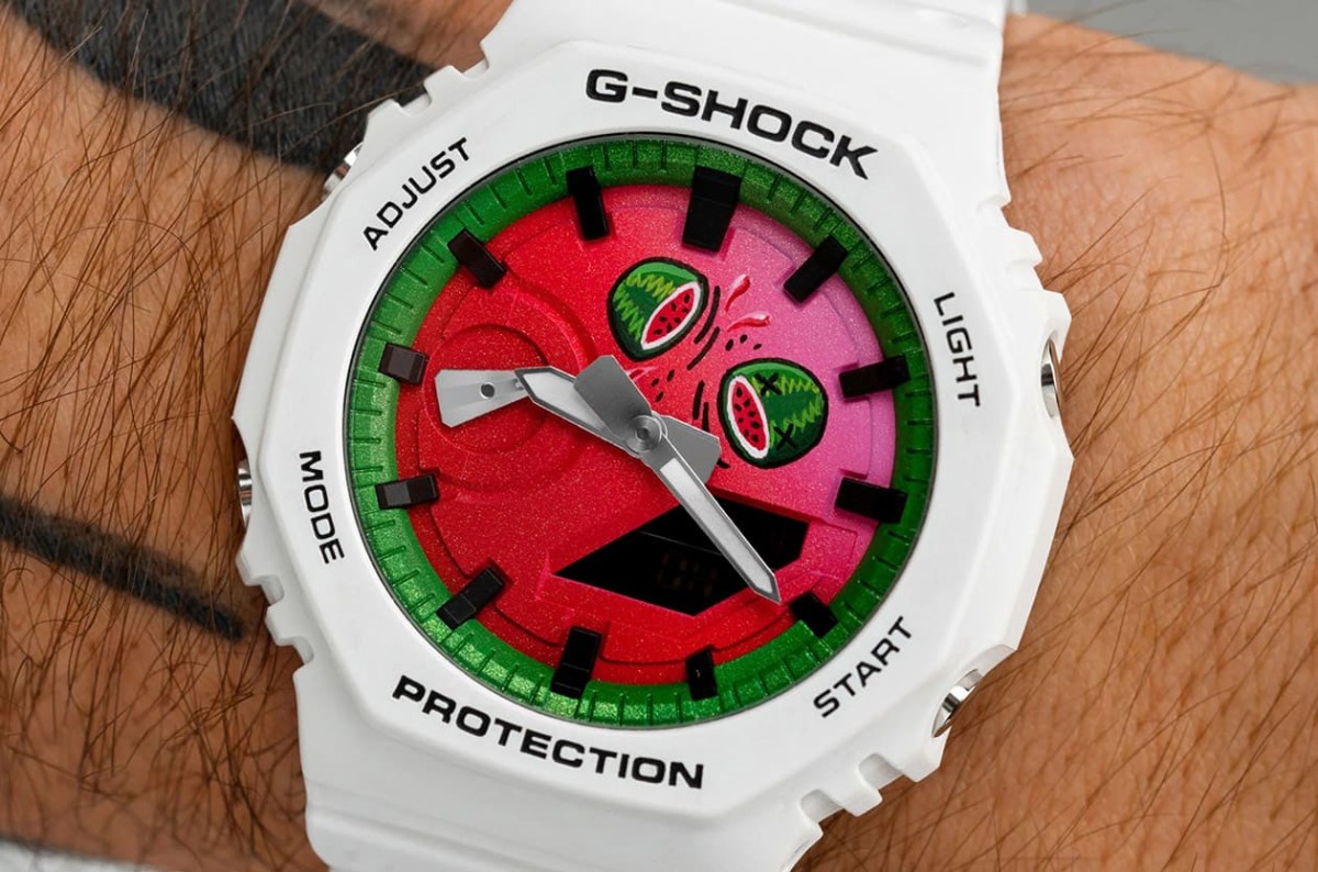 首先看到的是CasiOak Post Melone,IFL Watches將錶圈上的品牌名稱以及其他按把說明文字都填上黑色,而在面盤部分一如錶名融合了清爽宜人的擬人化水果圖案——西瓜,藝術家先在面盤外圍彩繪上鮮綠色,然後在面盤的右上角開始畫上粉紅色,一路往左下角顏色愈變愈深,最終形成像是西瓜果肉般的紅色,此時包括時標的黑色以及錶圈字樣的黑字,看起來就像西瓜籽一樣,在白色錶殼與鍊帶的襯托下特別顯眼。