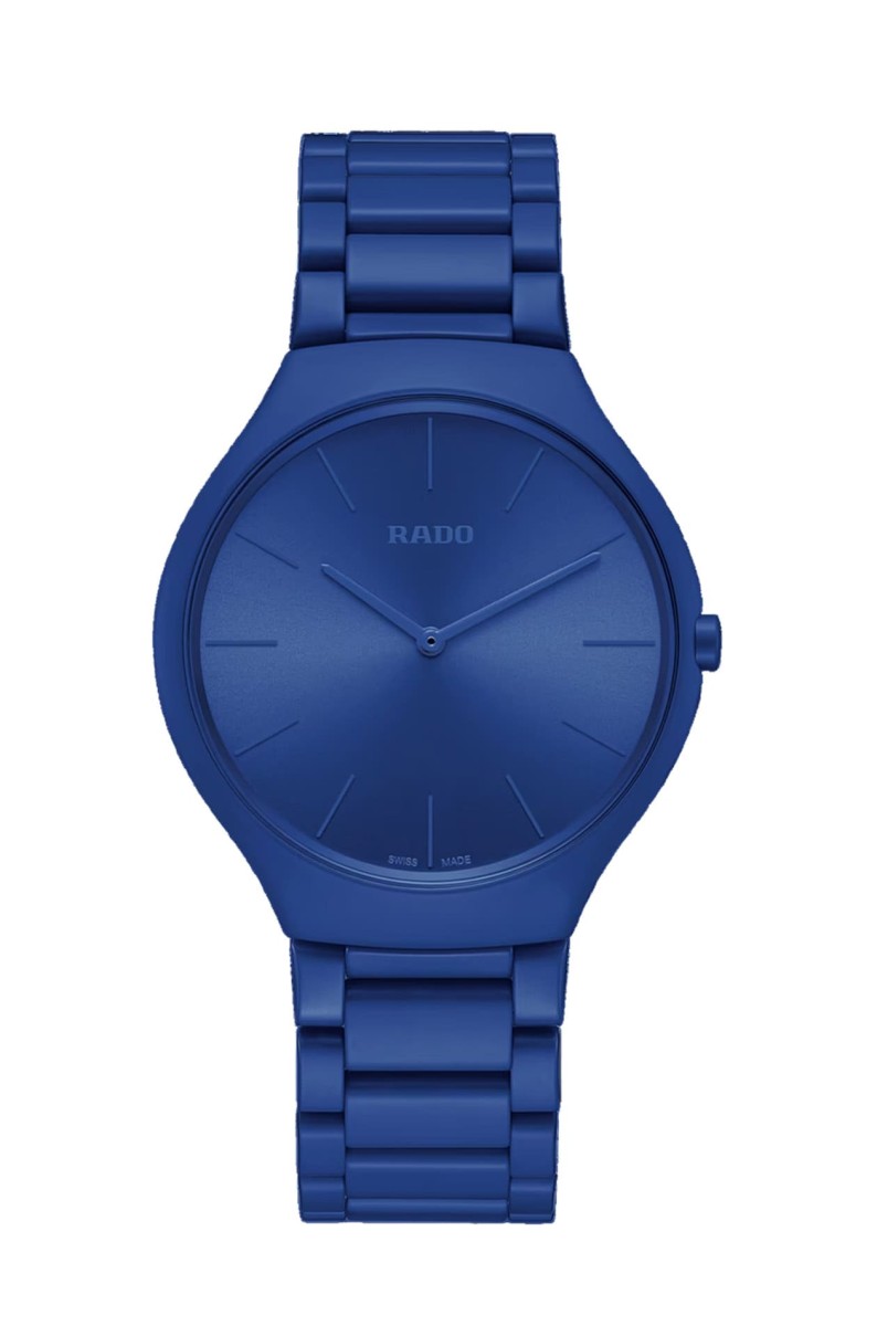 RADO為了致敬現代建築之父柯比意(Le Corbusier)發明的「建築色彩學」,創作出多達九種顏色的真我超薄系列幻彩高科技陶瓷限量錶,其中當然就有從錶殼、鍊帶到面盤都是藍色的款式(品牌官方名稱是「絢麗藍」)。雷達表研發的高科技陶瓷具備耐用、不易磨損及抗敏等特性,可以為佩戴者帶來舒適的觸感,別忘了手錶還帶有超薄這個特色,它的錶殼厚度僅4.9mm,戴在手上既薄又輕盈,而且錶殼的耐刮、不褪色特性等,皆讓手錶在日常使用無往不利。手錶搭載石英機芯,面盤上僅有簡約的二針顯示,雷達表設計的面盤和整只錶的形象相符,面盤僅有線型時標還有品牌字樣,搭配與錶殼、面盤同色系指針,飽和的色彩讓手錶相當搶眼。品牌在實底蓋上加入柯比意開發出的色帶設計圖案,上頭共有多達63種顏色,而真我超薄系列幻彩高科技陶瓷限量錶就是從這些顏色中精選出9種最受歡迎的顏色,以顏色的力量賦予陶瓷錶殼滿滿魅力。