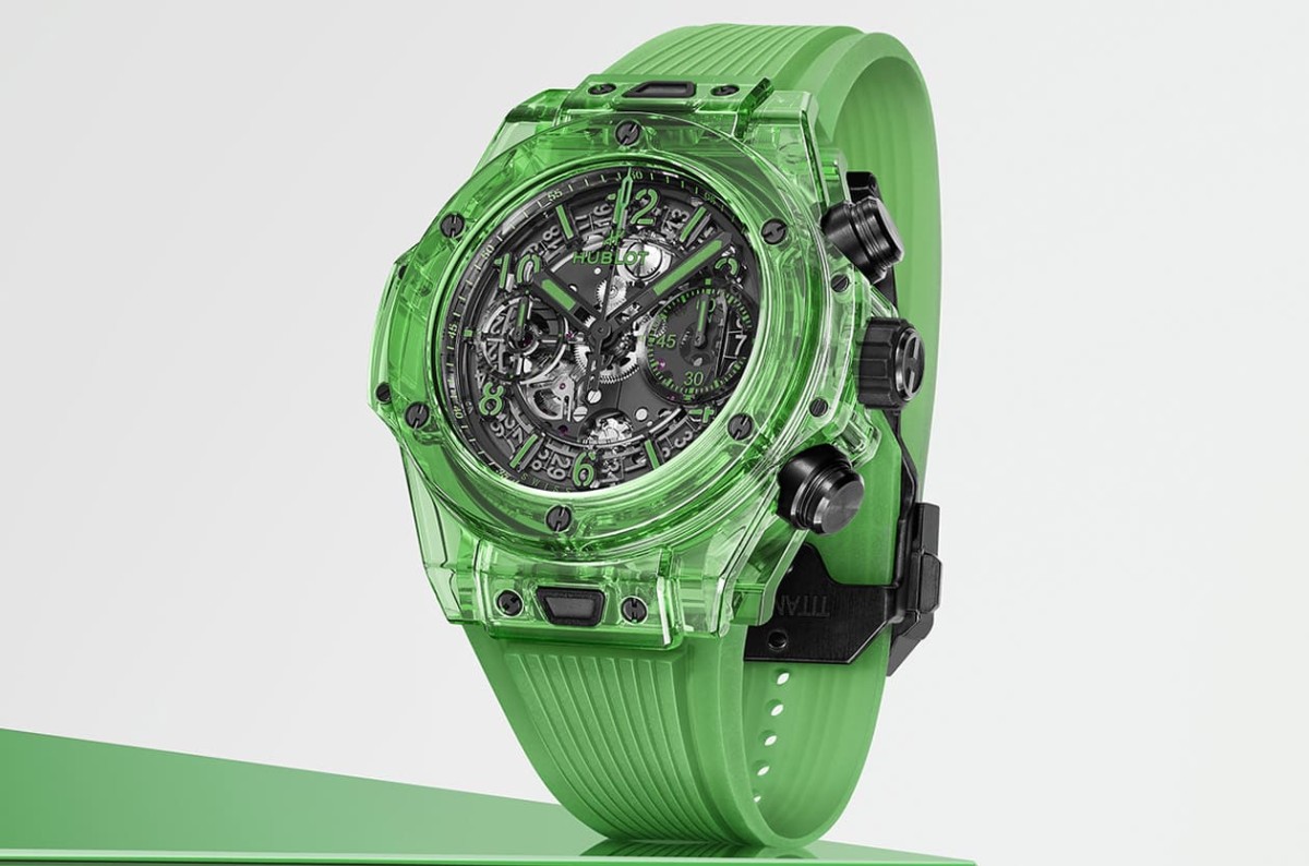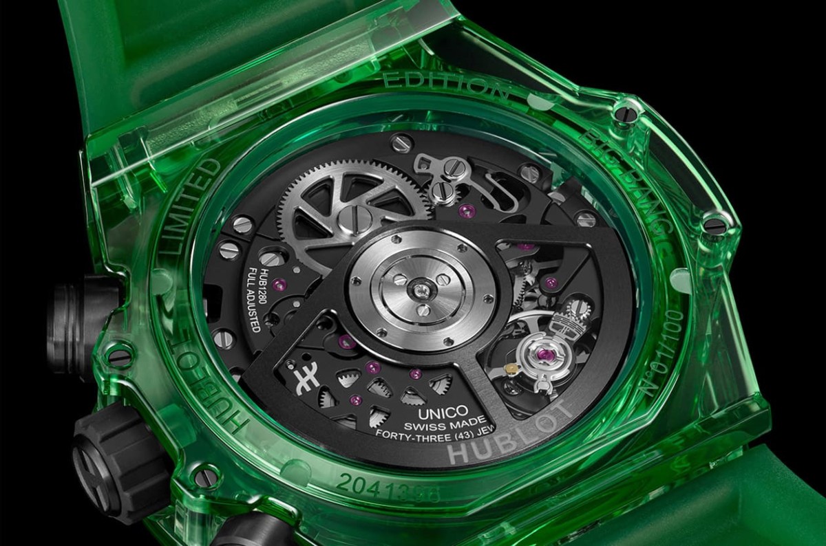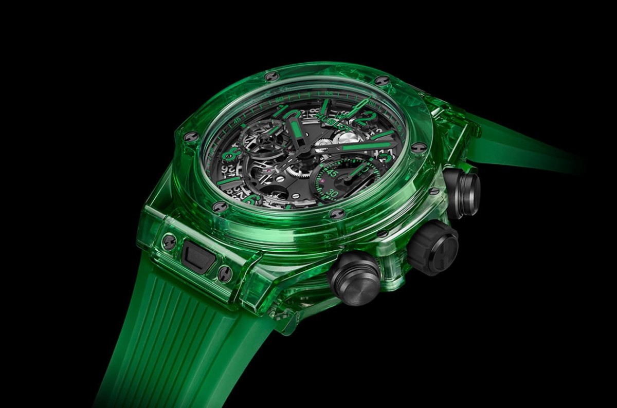 HUBLOT宇舶旗下開創出許多彩色透明錶殼作品,然而它們不盡然都是成分中添加過金屬氧化物的藍寶石水晶,像是品牌曾應用至MP-11、Spirit of Big Bang計時碼錶抑或Big Bang陀飛輪的"SAXEM"材質,就屬於類藍寶石,但又並非狹義的藍寶石材質。2024年宇舶持續以綠色的SAXEM材質創作Big Bang Unico計時碼錶,將高科技材質與自家招牌的系列作品相結合,激盪出非常迷人的新火花。
