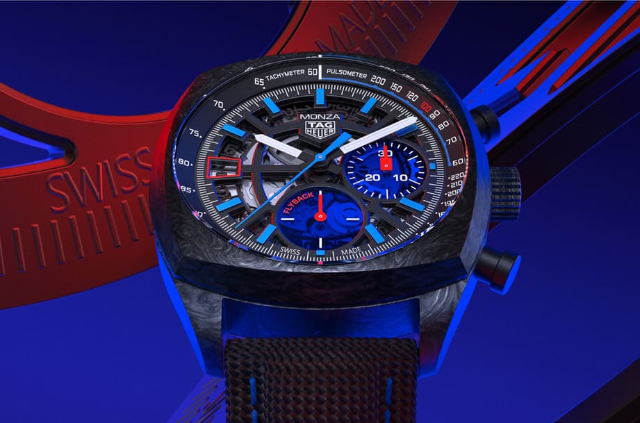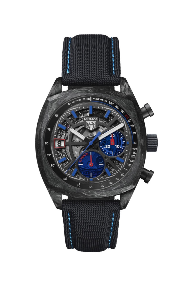 泰格豪雅這次終於不再以復刻為手錶創作主軸,反而是奠基於Monza計時碼錶的招牌設計,從中加入更多現代元素詮釋出嶄新風格。首先手錶改用碳纖維材質製作42mm的錶殼,一方面延續系列帶有黑色外觀的傳統,但是改以碳纖維這種與賽車界緊密相關的高科技材質,比起純在金屬表面鍍上黑色既可以有感降低手錶的重量,另一方面,碳纖維材質不規則的紋路還能讓每款錶看起來都獨一無二。泰格豪雅這次替手錶配上黑色織物錶帶,兩側縫線則是淺藍色,如此可以達到替手錶點綴的效果,同時也隱隱呼應面盤細節的顏色。