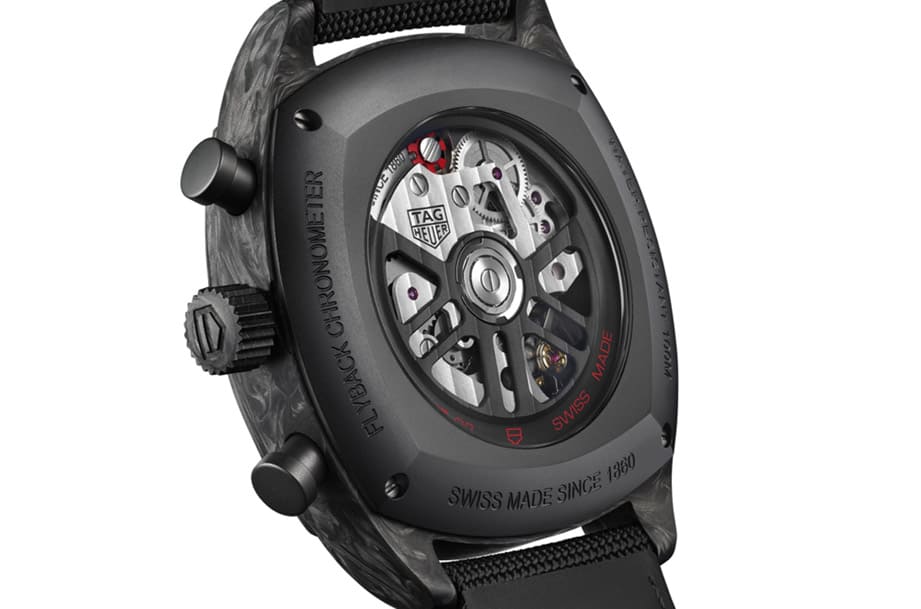 Monza計時碼錶搭載獲得瑞士天文台認證(COSC)的Heuer 02自動飛返計時機芯,飛返計時的優點在於佩戴者能在不停止計時的情況下,啟動黑色DLC塗層的不鏽鋼按把直接開始新的計時任務。同樣擁有黑色DLC鍍層的尚有鈦金屬錶背,透明底蓋下可見機芯的鏤空自動盤也鍍成黑色,而且與機芯基板同樣都飾有日內瓦波紋。通常Heuer 02機芯搭配在不同作品上會有許多設計變化性,例如這款機芯內部的導柱輪就鍍上紅色,與自動盤邊緣的紅字乃至面盤上的紅色細節都有互相呼應的味道。而機芯的規格放眼市面上的計時碼錶都不遑多讓,例如擺輪震頻28,800vph、動力儲存80小時等,都讓人可以戴得輕鬆又放心。