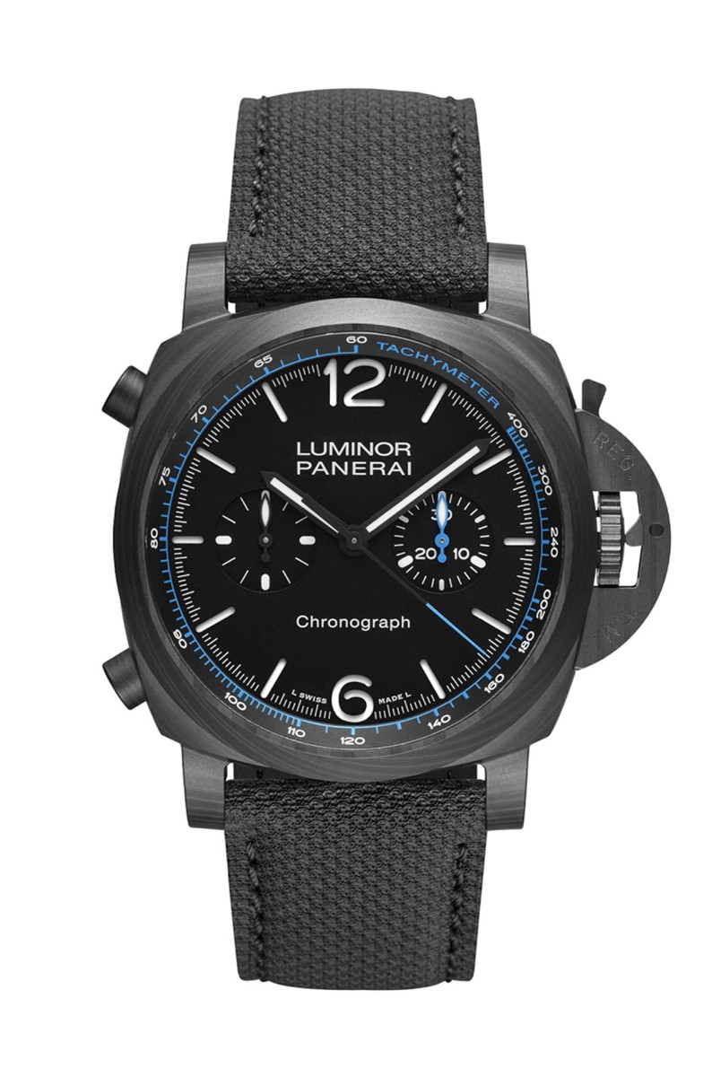 ▲Luminor Chrono PAM01219錶殼以Carbotech™製成,搭配黑色織物錶帶,形塑時尚黑色風格。