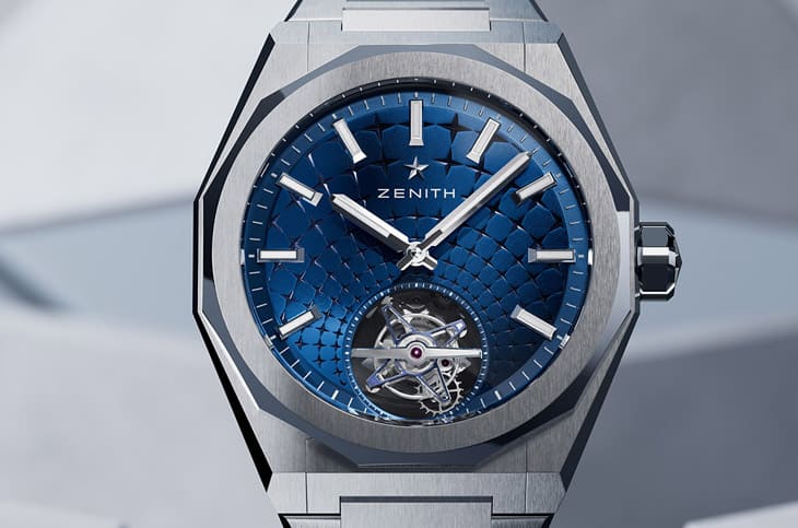 精鋼款與黑色陶瓷款的DEFY Skyline陀飛輪腕錶分別採用藍色與黑色面盤,此款式面盤的招牌設計在於真力時獨家的四芒星圖案,然而新作由於升級為陀飛輪複雜功能,品牌也因此重新設計了面盤的四芒星圖案,由原本整齊的縱橫排列,改為以6點方向的陀飛輪為中心,並往外依序放射出由小漸變至大的四芒星圖案,這使得陀飛輪裝置宛如位於星系的中心,周圍的四芒星圍繞其發出耀眼光芒,烘托陀飛輪每60秒轉一圈的規律動感。真力時為了提升陀飛輪裝置的運作穩定性,機芯在陀飛輪軸心頂部設置經過鏡面拋光,並且帶有斜角處理的固定橋板,加上陀飛輪裝置外圍設有刻度,還能輔佐面盤中心的時、分指針衍生出小秒顯示的功用。