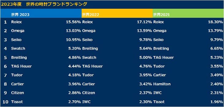 有的品牌下滑,自然也有的品牌正在上升,像是日本兩大知名品牌SEIKO和CITIZEN都榜上有名,前者一如前面提到高居第3名,至於後者也能夠排到第9名的位置,而且兩個品牌的銷售比例比起2022年都有所成長,在競爭激烈的手錶市場上顯得難能可貴。