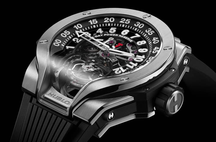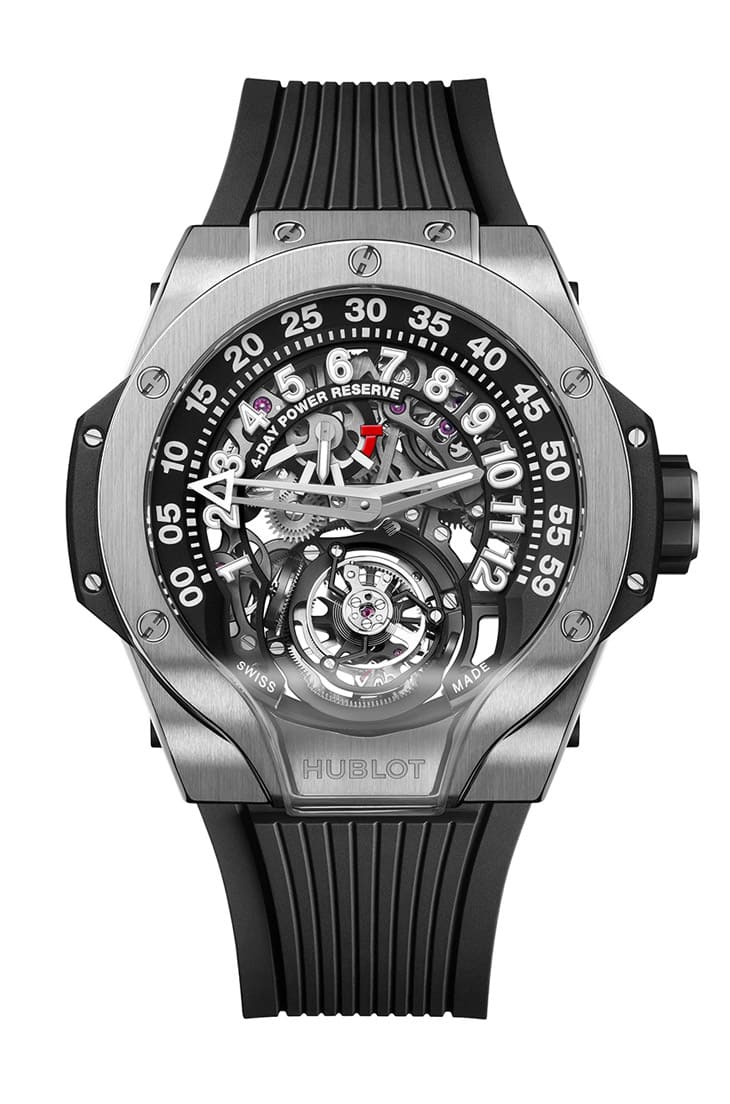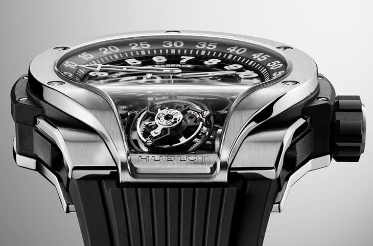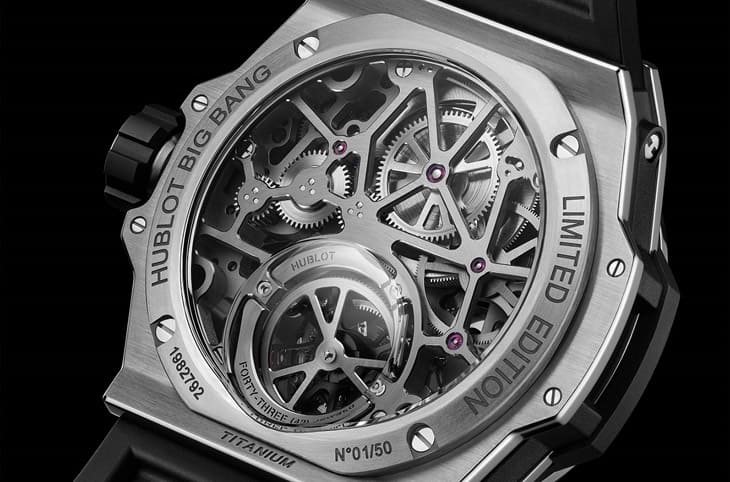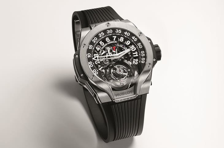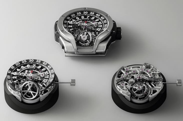 鈦金屬材質/HUB6200手動上鍊機芯/逆跳時、逆跳分顯示/雙軸陀飛輪裝置/動力儲存顯示/藍寶石水晶鏡面、透明底蓋/防水30米/錶徑44mm/限量50只/參考價:NT$ 5,093,000