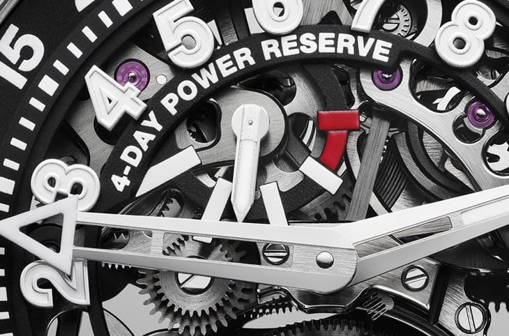 附帶一提,宇舶還在鏤空面盤約11點方向設置了動力儲存顯示,MP-13的動力至多達96小時(放眼市場上具有同功能組合的作品,MP-13的動力絕對名列前茅),透過劃分成4格的動力儲存顯示,搭配白色與紅色的刻度,使人能夠直覺地以24小時為單位判讀腕錶剩餘的動力,一旦指針走到紅色區塊,代表佩戴者替發條盒上鍊的「補給」時刻也即將到來。