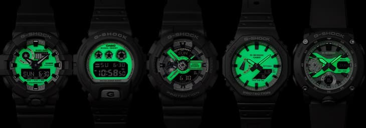 卡西歐G-SHOCK最近以磷光面盤設計為主題,開創一系列Hidden Glow新作。此系列以5個人氣型號為基礎,包括人氣八角錶圈設計的農家橡樹GA-2100、特色三眼的DW-6900、獨特立體面盤的GA-110、擁有大型錶殼的GA-700與具備碳核心防護構造的GA-2000等等。