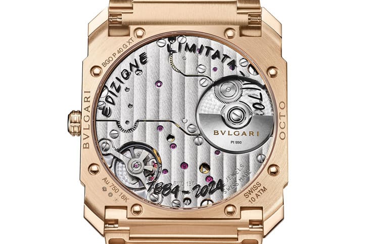 ▲Octo Finissimo Automatic Sketch搭載的BVL 138機芯,與面盤圖案對照可見草圖在設計產品時的重要性。底蓋上下緣額外印上限量字樣以及品牌創立至今的年份,別具意義。
