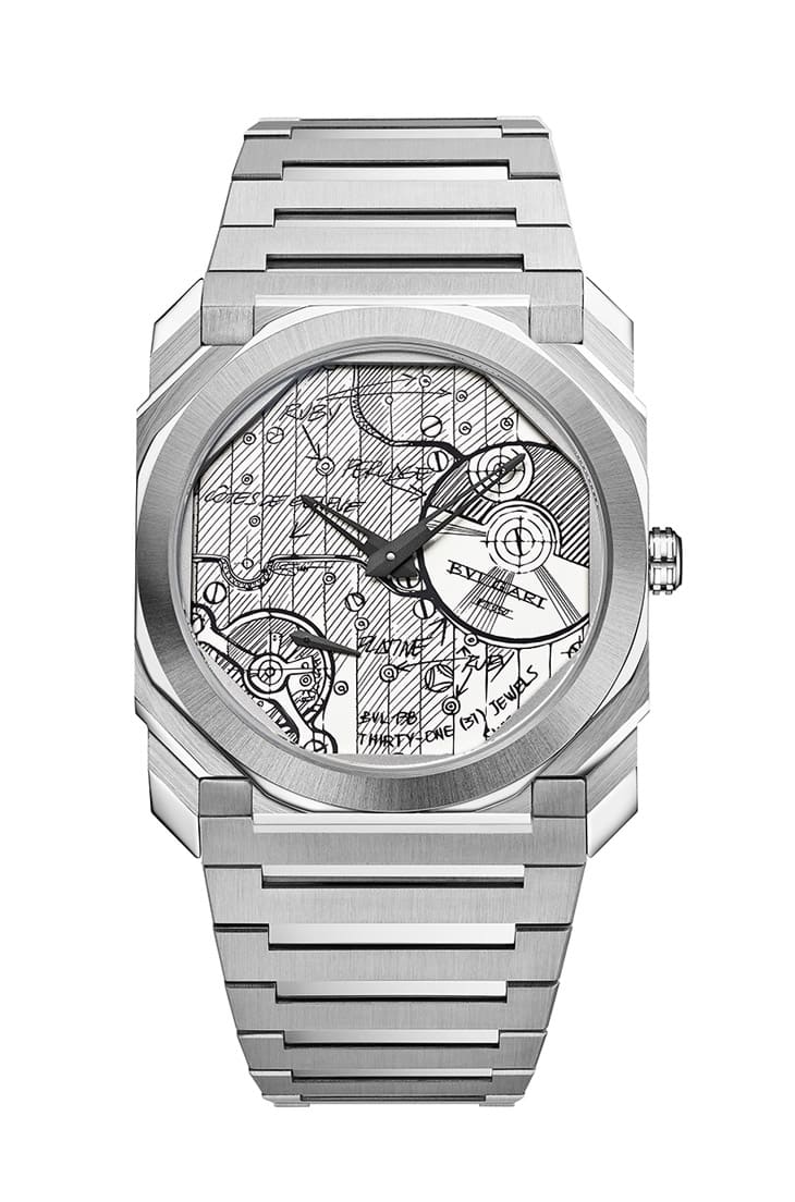 Octo Finissimo Automatic Sketch分別有不鏽鋼與玫瑰金兩種款式,它們都是限量發行,不過前者的發行數量為後者的4倍,數量差異用以烘托錶殼材質的貴重稀有程度。以不同材質製作的錶殼與鍊帶和多數Octo Finissimo超薄錶沒什麼兩樣,最明顯的不同還是在於手錶面盤變成了寶格麗手錶產品設計執行總監Fabrizio Buonamassa Stigliani親手繪製的機芯草圖。