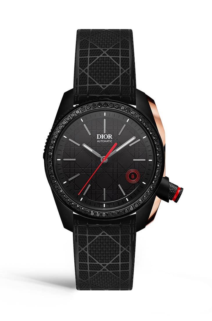Chiffre Rouge 38mm自動上鍊腕錶以DLC類鑽碳電鍍材質於不鏽鋼錶殼外部覆上神祕中帶點潮酷感的黑色調,在此同時腕錶深植人心的不對稱錶殼造型依舊傳承著20年前的大膽創意,腕錶於9~12點方向的錶圈側邊刻意做出鋸齒狀造型,至於右側錶殼則帶有銳利的切面,這種設計上的巧思不影響腕錶的功能與品質,卻能建立起鮮明的特色,加上Chiffre Rouge 38mm自動上鍊腕錶的錶冠偏置於錶殼4點方向,設計別具一格。迪奧替腕錶配置點綴大型籐格紋(Cannage)黑色橡膠錶帶,這條錶帶不只特色十足,還具備便利的錶帶快拆系統,佩戴者在腕錶背面可見錶帶與錶耳連接處各有一枚小小的"DIOR"金屬銘牌,只需左右移動這裡的快拆裝置,便能輕鬆拆卸錶帶,隨時替腕錶轉換不同風格。38mm的Chiffre Rouge新品尚有一款鑲鑽限量版,其與非鑲鑽版有兩個主要的細節差異,首先是迪奧在這款錶的錶圈鑲上60顆黑鑽,低調強化腕錶的高雅質感,同時錶殼右側延伸的切面造型護橋亦改用玫瑰金材質,點亮腕錶視覺層次。