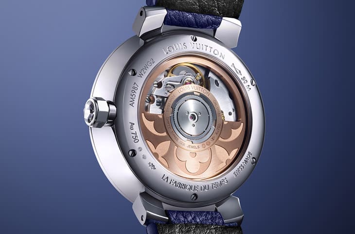 ▲透明底蓋能夠一眼看見玫瑰金自動盤,其上刻有Monogram Flower圖案,同時機芯的零件修飾也能在自動盤騰出的另一半圓空間中看個過癮。