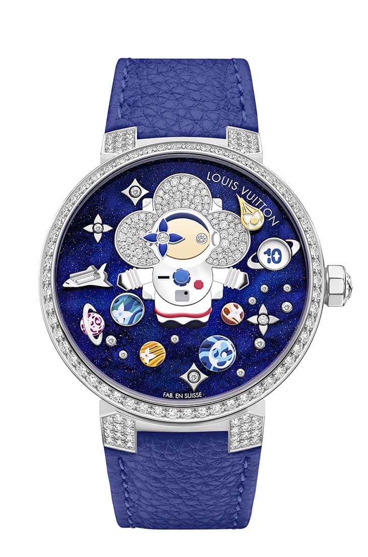 ▲路易威登創作出新款Tambour Slim Vivienne跳時錶,品牌運用高超的裝飾工藝,分別呈現櫻花與太空人兩大主題。