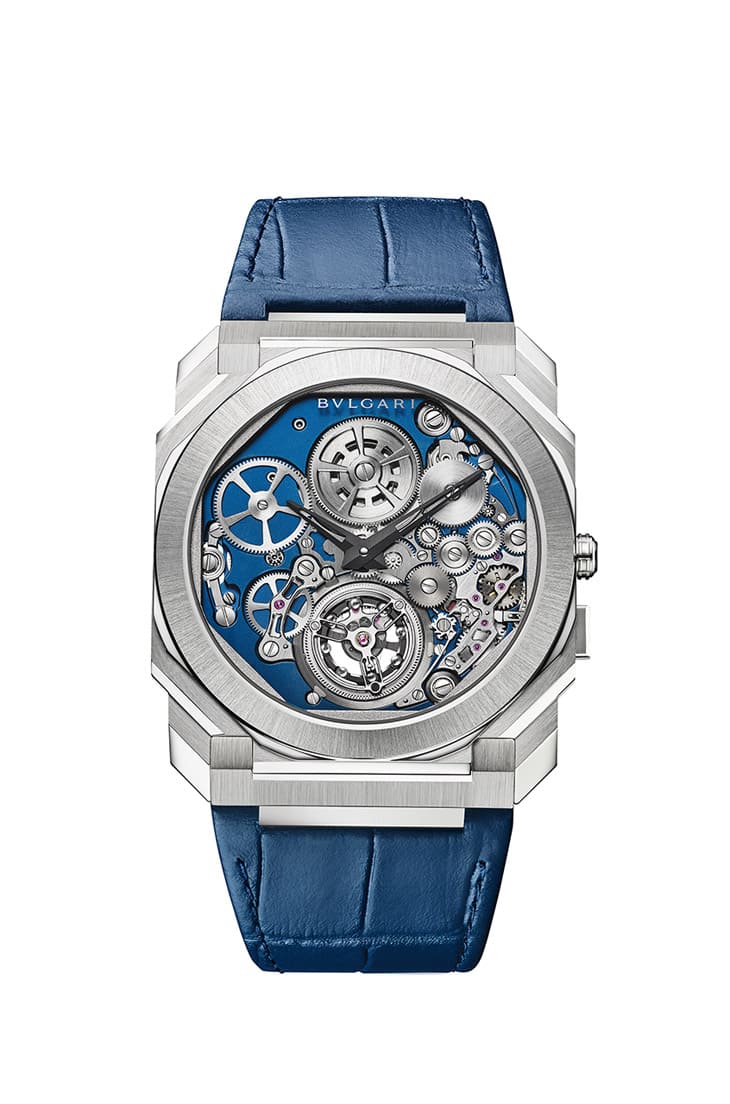 至於Octo Finissimo Tourbillon Automatic乃是以鉑金製成,配置藍色鱷魚皮錶帶,其機芯正、反面零件有需多皆經過藍色微噴砂處理,與齒輪的銀灰色調相稱形成吸睛的雙色效果,寶格麗為了讓佩戴者能夠清晰讀時,因此將鏤空指針鍍成黑色,豐富的色彩層次也成了這款錶在超薄造型之外的隱藏特色。