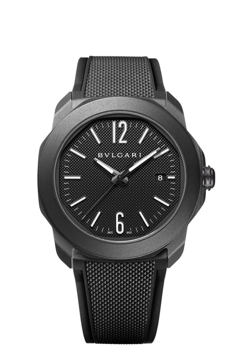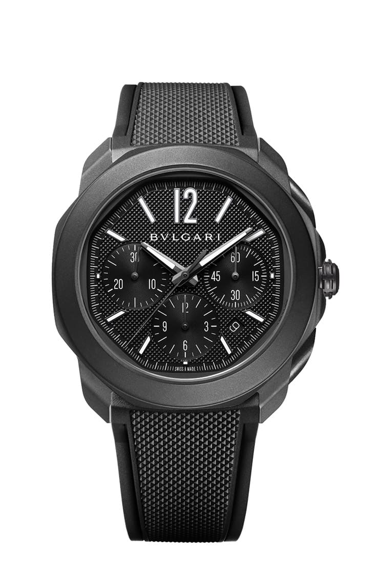 Octo Roma今年的主軸是黑色系,因此包括大三針與計時碼錶分別都有採用黑色DLC不鏽鋼材質的新品問世。兩款All Black風格的Octo Roma都配有黑色巴黎釘紋橡膠錶帶,而且寶格麗還會附上一條黑色鱷魚皮錶帶供錶主替換,同時它們的旋入式錶冠都有鑲上黑色陶瓷點綴,搭載的機芯不同可是都有透明底蓋設計,防水性能也都是突顯休閒用途的100米水準。除此之外,兩款錶的黑色面盤都有立體的巴黎釘紋以呈現光影變化效果。Octo Roma Automatic Steel DLC自動錶搭載BVL191機芯,動力儲存為42小時,而Octo Roma Chronograph Steel DLC計時碼錶則是搭載BVL399自動機芯,動力儲存同為42小時。