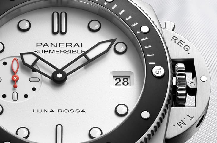 至於PAM01579和PAM01565最明顯的不同出現在面盤,前者以以壓印工藝塑造出微微的粒紋質感,然後會塗上白色以呈現霧面效果,同時間面盤上的字樣如"PANERAI"和"LUNA ROSSA"等則改為與白色對比的黑色,而且和PAM01565面盤字體相較,白面款的黑字感覺相對較細;同樣顏色轉換的還有時標外框與指針,它們皆鍍上黑色,並填入白色的Super-LumiNova®夜光塗層,在黑暗環境中也能夠清楚顯時,至於手錶悄悄埋藏與Luna Rossa帆船隊聯名的元素——紅色小秒針也貫穿著兩款Submersible小三針,這種顏色與Luna Rossa帆船隊的訓練船圖船身塗裝呼應,不管放在白色面盤或深藍色面盤都很顯眼。