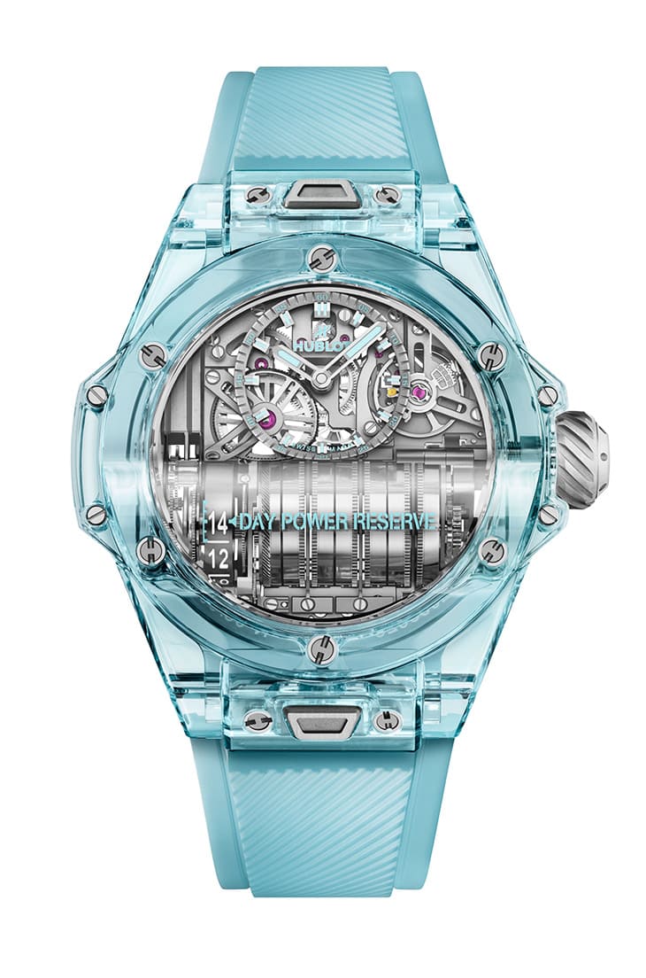 不讓陶瓷材質專美於前,宇舶近年在研發藍寶石透明錶殼的成果同樣有目共睹,品牌在日內瓦鐘錶與奇蹟錶展再度超越自己,包括Big Bang MP-11手錶、Big Bang Unico計時碼錶以及Spirit of Big Bang Sang Bleu計時碼錶,都紛紛啟用這種堅硬又具有全方位視角的高科技材質。首先在功能最複雜的Big Bang MP-11手錶部分,宇舶又再新創出湖水藍寶石一展新氣象,一如既往這種「特殊色」藍寶石保有高硬度與高耐磨抗刮性,而且材質本身的穩定性也很高,加上它的湖水藍色透明度系數經過品牌精密計算且測試無虞,讓人得以藉由「有色眼光」欣賞手錶搭載的HUB9011手上鍊機芯,這枚機芯採用立體結構,尤其發條盒多達7枚串連在一起形成滾筒狀,能合力輸出長達14天的動能,使得經鏤空處理甚具賞玩逸趣的手錶,其實用性也被推向極致。