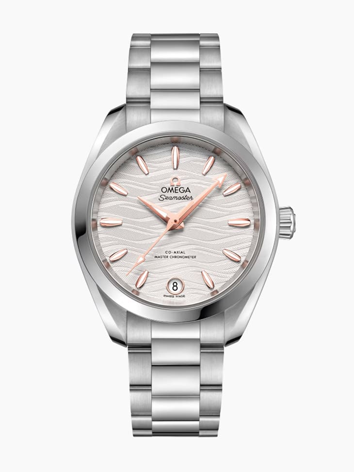 不鏽鋼材質錶殼、錶徑為34mm。它配置的金屬鍊帶使得手錶可以戴著因應任何場合的需求,以女錶而言,150米防水性能算是很強的一款作品。它的波浪紋蛋白石銀色面盤點綴著Sedna™金時標與指針展現低調奢華氣質,而女性會喜歡歐米茄手錶這應該不是什麼祕密。