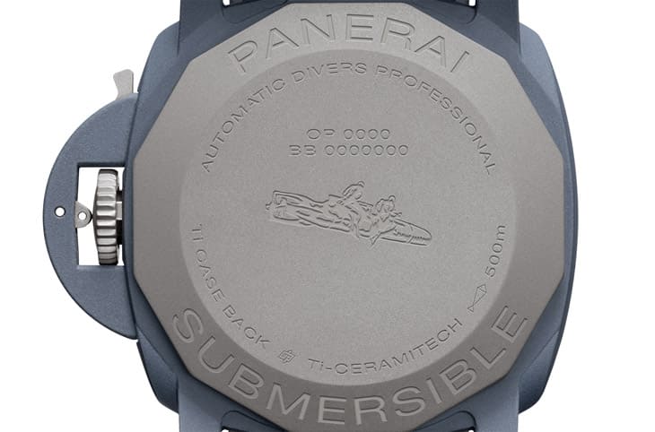 ▲鈦金屬底蓋刻有慢速魚雷圖案,底蓋包覆著沛納海主力基礎機芯P.900,動力儲存長達3日。手錶在啟用科技材質後,防水性能進化至500米成了一個隱藏亮點。