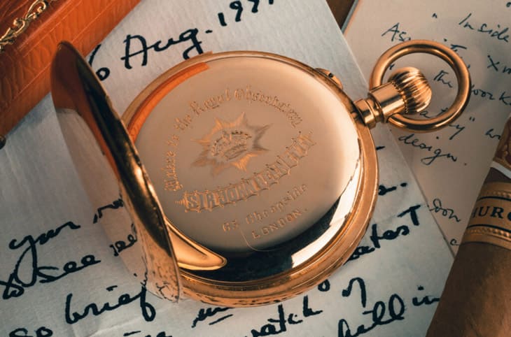 帶有獵錶設計的這只懷錶在正面的錶蓋上刻有邱吉爾的爵士徽章圖案,內側則刻有"To Winston with gratitude H. H. Asquith Xmas 1905."字樣,清楚交代了手錶的來龍去脈。懷錶本身的特色除了以18金製作以外,還包括無鑰匙上鍊機芯、三問報時功能、白色琺瑯面盤、金色中央鏟形時針和鞭形分針,搭配6點鐘位置小秒盤的藍鋼秒針等。當初H. H. Asquith是從被譽為「皇家天文台時計製造商」的知名製錶師John Bennett爵士那購入這款錶,因此獵錶的錶蓋掀開後,在背面的底蓋上可以看到刻有這位製錶師工作坊的標誌。