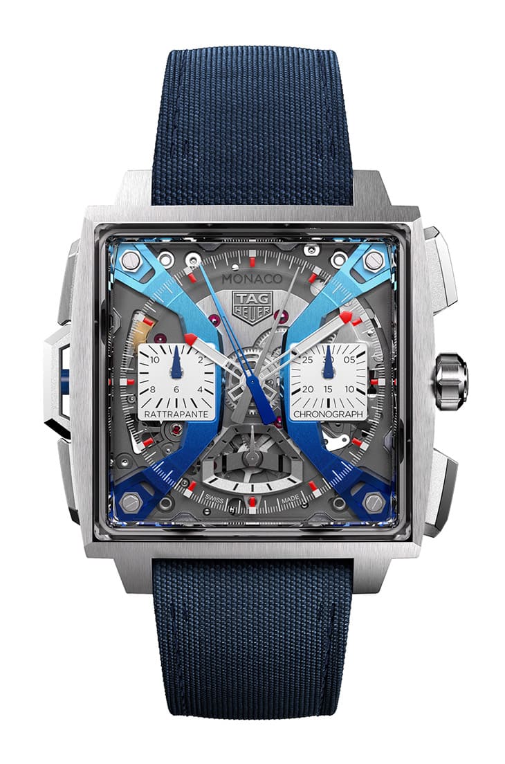 Monaco雙追針計時碼錶一改系列傳統面盤設計,改用開面結構露出更多機芯金屬組件,其中最引入注目的是固定於面盤四個角落延伸形成的雙拱形橋板,遠看猶如在面盤放上一個大大的"X"字型,至於面盤整體還是維持Monaco系列由圓形刻度包含方形計時小錶盤的設計;在開面結構中,小錶盤底下的輪系、機板與紅寶石軸承等都一併呈現於腕錶正面,帶來更為複雜、立體的視覺張力。Monaco雙追針計時碼錶搭載品牌與著名機芯廠Vaucher合力研發的TH81-00自動機芯,透過設計並採用鈦金屬材質製作的機芯不僅複雜度高,重量也大幅降低,成為泰格豪雅旗下最輕的自動計時機芯之一。追針功能以面盤中央軸心的兩枚計時秒針實現,其能同時測量兩組時間,計時的便利性升級之際,也代表著機芯的製作難度顯著提升。