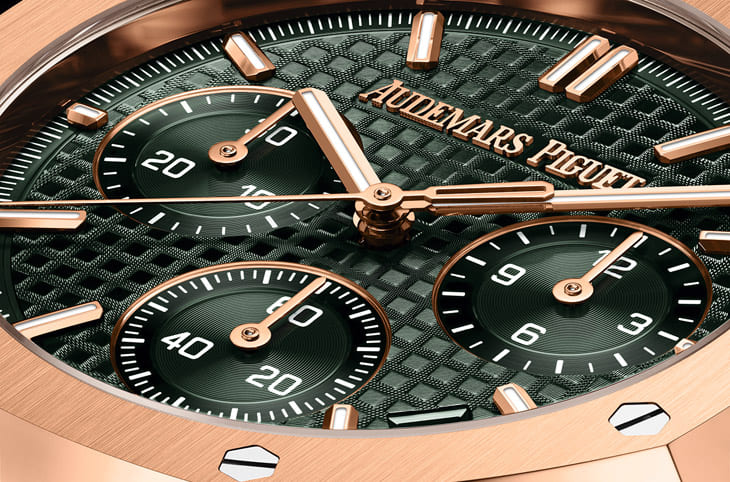 皇家橡樹自動計時碼錶與同年其他一起上市的RO手錶相同之處還有面盤細節的改造,愛彼AP為了加強系列整體的統一感,因此不同功能、尺寸的RO手錶,它們的時標與指針如今都採用統一的尺寸。再來愛彼也將前幾年首度應用於CODE 11.59系列的電鍍生成法(類似3D列印)Logo移植到皇家橡樹系列中,取代舊款那種併用立體AP Logo及印刷品牌Logo的作法。錶款的Grande Tapisserie大型格紋面盤以軍綠色重新演繹,搭配面盤上的玫瑰金時標、指針等細節顯得一拍即合,原本品牌在皇家橡樹50週年的前一年曾創作過黃金錶殼搭配鮮綠色面盤的舊款皇家橡樹自動計時碼錶,但在系列改朝換代後,這種綠金款很快就停產,取而代之是玫瑰金搭配綠色面盤的組合。從手錶的三眼小錶盤尺寸又變得大小更接近、計分盤與計時盤位置左右對調可知,手錶內部的機芯已經煥然一新了。