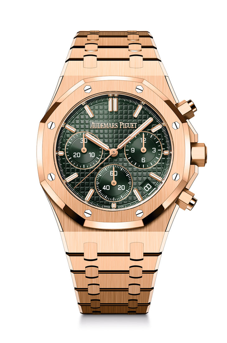 愛彼在前兩年Royal Oak皇家橡樹系列50週年里程碑時大量更新了旗下的作品,包含錶徑41mm的自動計時碼錶也有了許多內、外細節的轉變,乍看手錶好像和之前的印象差不多,其實品牌下了許多功能在調整細節,朝著更精鍊、易讀以及佩戴更舒適的方向進化。這一批新生代的皇家橡樹自動計時碼錶當時一現身就從不鏽鋼到玫瑰金強勢出了一輪,搭配不同面盤顏色讓手錶能衍生出彼此的個性,其中綠色面盤又絕對是玫瑰金皇家橡樹自動計時碼錶最吸睛的一款,從當時起即已獲得許多收藏家鎖定。