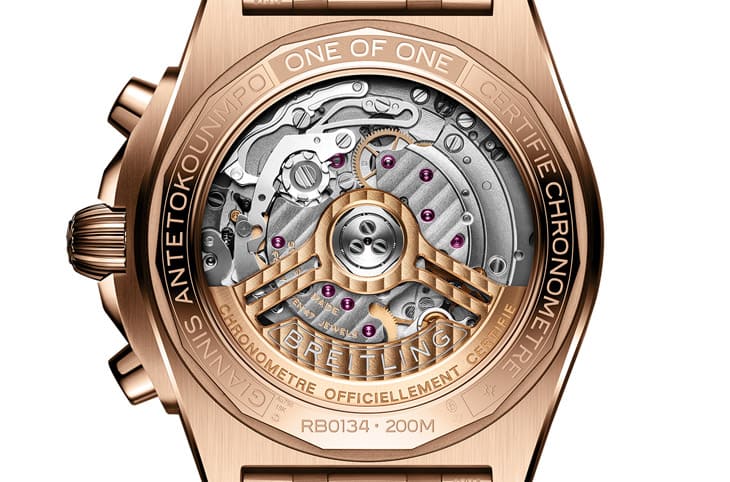 18K玫瑰金材質/B01自動上鍊機芯/時、分、小秒、日期顯示/計時碼錶功能/藍寶石水晶鏡面、透明底蓋/防水200米/錶徑42mm/獨一無二款式,專屬Giannis Antetokounmpo本人