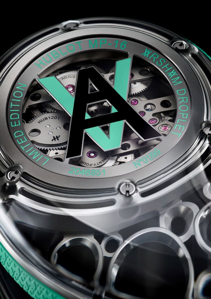 宇舶于怀表背面边缘刻上了怀表名称、限量资讯以及怀表的限量编号(100只)等,透明底盖边缘还放上了大大的Daniel Arsham Logo——这几个部分也纷纷填上「Arsham绿」,如此一来多少遮住了HUB1201机芯的背面视野,可是对于Arsham Droplet钛晶怀表这种限量作品而言,这种设计蕴含的独特性能完全弥补赏表视野被局部遮蔽的不便,让怀表背面一看就充满鲜明的辨识度。
