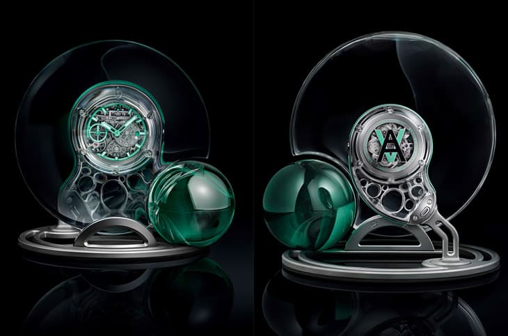 Arsham Droplet钛晶怀表不只可以放进表主服装内的口袋,宇舶也替其制作了项链与腰链可以变换穿戴模式,而在表主回到家拿出怀表后,这款怀表又能摇身一变成为居家装饰用的座钟,关键有二,其之是Arsham Droplet钛晶怀表具备的双面“One Click”单键表带快拆装置,它可以让表主轻松拆下项链或腰链,接着将取下的表头放置在Daniel Arsham设计的专属展示座,怀表就能作为座钟显示时间,这个展示座是用钛金属和透明玻璃制成,其中放置怀表的表头部分为透明圆弧造型,正面的镜面带有凸透镜的放大作用,其右下角有颗半透明「Arsham绿」的圆球,使得展示座呈现不对称造型,一旦把怀表表头置入后,这个展示座变成座钟完全体,看起来别具一种精雕细琢艺术品的美感,巧妙设计让制表与艺术两大领域有了完美的交集。