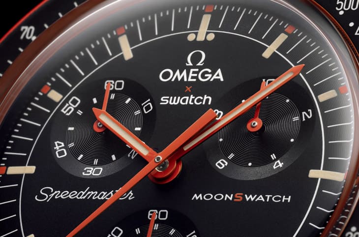 Mission on Earth-Lava的錶殼為紅橙色,直接呼應熔岩鮮豔卻又充滿危險的形象,至於手錶的生物陶瓷錶圈、VELCRO®錶帶和面盤則都是黑色,用以突顯出錶殼、計時按把與錶冠紅橙色的搶眼感。雖說錶款的設計主題與過往不同,但是手錶整體造型、尺寸大致都和先前的MoonSwatch大同小異,不過以Mission on Earth-Lava為例,它事實上還悄悄挹注了Speedmaster Moonwatch "Ultraman"錶款的梗,從手錶指針的橙色以及中央計時大秒針的造型等處可略窺一二。