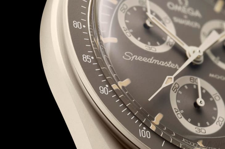 最後看到的Mission on Earth-Desert採用沙色生物陶瓷錶殼,猛一看和2022年出道的Mission to Jupiter(木星)、Mission to Saturn(土星)有點神似,不過手錶的VELCRO®錶帶、生物陶瓷錶圈和面盤等都是米灰色,這樣的配色組合和前面提到的兩款前作又有明顯不同,濃濃的大地色系讓人聯想起廣袤的沙地景致,光用想的都覺得當地實在熱翻。從這款和極光款的計時大秒針造型又回復到與之前MoonSwatch一致的設計可知,熔岩款的計時大秒針因為有特定的設計繆思所以才自成一格,這點和這次3款新作的小錶盤造型乃是共同的變化目的不一樣,不過反正設計上的細節主要是用來突顯手錶的個性,不管有沒有變化,對於閱讀時間而言都不會有太大的影響。