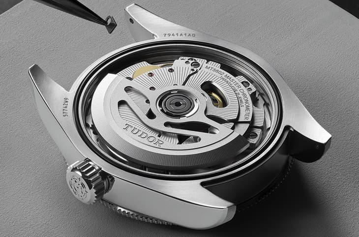 Black Bay搭載的是MT5602-U機芯,機芯夾板與底板以磨光及噴砂飾面互相交錯,它的自動盤也經過鏤空處理並結合放射紋修飾。這枚機芯除了經過瑞士天文台認證(COSC)外,還要進一步交由瑞士聯邦計量科學研究院(METAS)的大師天文台精密時計認證檢測,確認手錶具備每日平均走時誤差不得超過5秒(0+5)、需在15,000高斯的高磁場環境下保持走時精準、防水性能及動力儲存也要能符合國際標準化組織(ISO)的22810:2010標準等,簡單來說猶如COSC認證的升級版,和一般帝舵的自製機芯相較,整體水準有了深度進化。