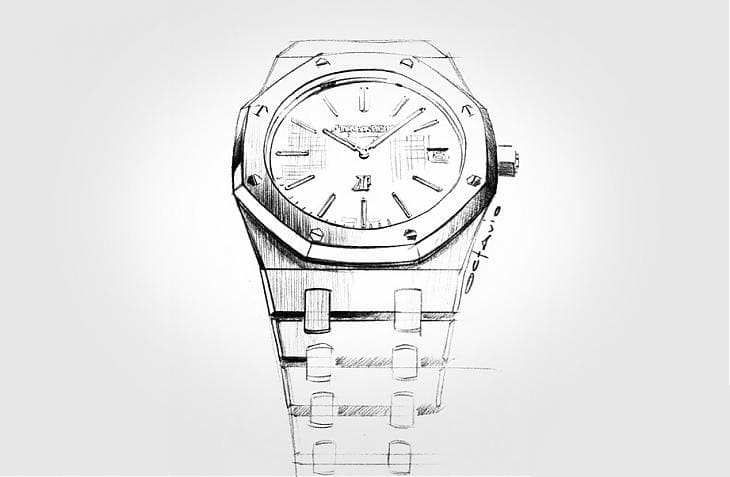結果Gérald Genta還真的接受了這個委託,當時他設計的手錶草圖跳脫了傳統框架,例如手錶外型蘊含酒桶型以及特色的八角形錶圈,Gérald Genta說他設計錶圈的靈感是來自潛水員的頭盔,從錶圈外露螺絲可知這種海底探險風格。設計師還幫手錶規劃了一體式鍊帶,搭配面盤上的立體格紋裝飾,這就是現在我們所知皇家橡樹手錶的雛形。