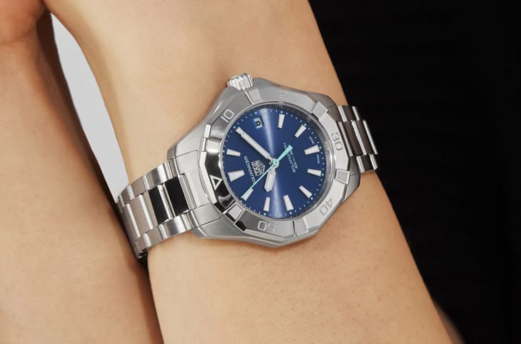 Aquaracer近年改款的頻率頗高,其中也包含了34mm的石英機芯款式,手錶外觀一如各式Aquaracer Professional潛水錶,整體造型與設計大同小異,例如錶圈造型、錶冠護肩,旋入式錶冠等等。它的錶耳間距其實有40.6mm,錶殼9.7mm的厚度也蠻紮實的,要用純粹女錶的角度看待這款錶似乎也不盡公允,大致上它還是可以算是中性的選擇。泰格豪雅替這款作品安排了多種面盤,例如這款藍色太陽紋面盤搭配綠松石色秒針的設計就很搶眼,手錶內部搭載TH50-01石英機芯,可以吸收光源蓄電,走時精準度比起機械機芯也更高,防水性能也是有200米的水準。