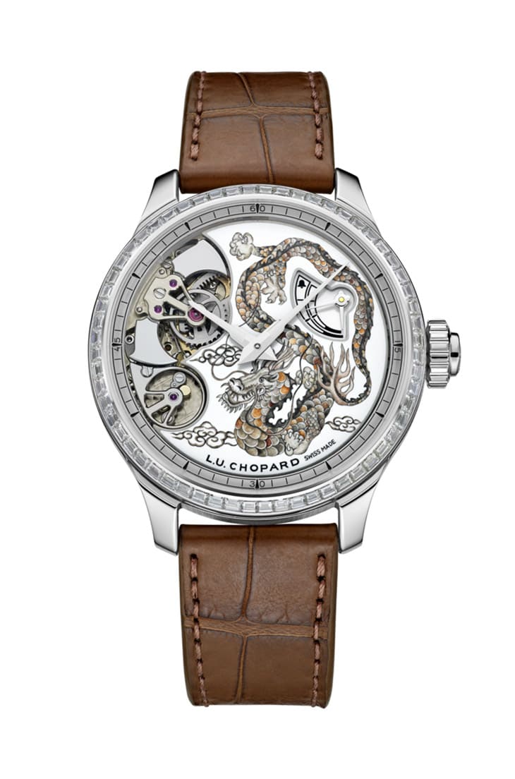 L.U.C Full Strike「龍年」錶將蕭邦擅長的兩大元素進行完美結合,一為尖端製錶工藝,二則為品牌倍受推崇的裝飾工藝,並且搭上2024年的龍年生肖主題,賦予手錶多重感官的極致饗宴。品牌以符合倫理道德標準的18K白金打造錶殼,並於錶圈鑲上數十顆長方形切割鑽石,搭配棕色手工縫製鱷魚皮錶帶,烘托出手錶內斂卻不凡的工藝高度。