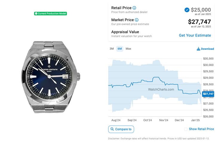 原本詢問度還算可以的鋼殼藍面Overseas大三針在前幾年嚐到爆紅滋味時,變得愈來愈難入手,二級市場價格也是扶搖直上,從有折扣空間成長至超定價水準,不過Overseas系列整體而言畢竟不像AP和PP的絕代雙驕那麼炙手可熱,所以系列旗下款式超定價款式相對較少,主要還是鋼殼藍面最受青睞。根據高級手錶市場調查研究機構WatchCharts的資料,4520V(大三針)在2024年7月時,國外報價約為28,413美金(約合台幣93萬8)已經可以窺見手錶的行情沒有像之前那麼夯了;另款鋼殼藍面Overseas目前功能最頂的陀飛輪款式(6000V)若把時間拉長點至2024年7月時,它的行情則有90,538美金(約合台幣299萬2),看似驚人,但其實這數字比手錶的國外定價129,000美金已經親切許多。