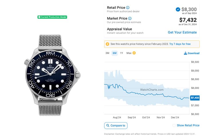 而在經過半年之後的現在,同樣從WatchCharts觀察的數據可知,兩款錶經過這段時間以來的發展,行情又出現了一點變化,210.90.42.20.01.001(007限定款)這期間價格有漲有跌,國外報價在6,900~7,200美金之間來回震盪,7月過後它開始一路跌,可是到了9月中後段至今又突然大漲一波,回到今年的高點,目前行情回穩達到7,184美金(約合台幣23萬5)的水準。而210.30.42.20.03.002(龐德電影60週年紀念款)則有點每況愈下,它的超定價行情持續到2024年5月中以後正式告終,在那之後連續八個月國外報價都是呈往下跌的走勢,如今進一步跌到剩下7,432美金(約合台幣24萬4),行情同樣是今年甚至是出道以來的新低點。