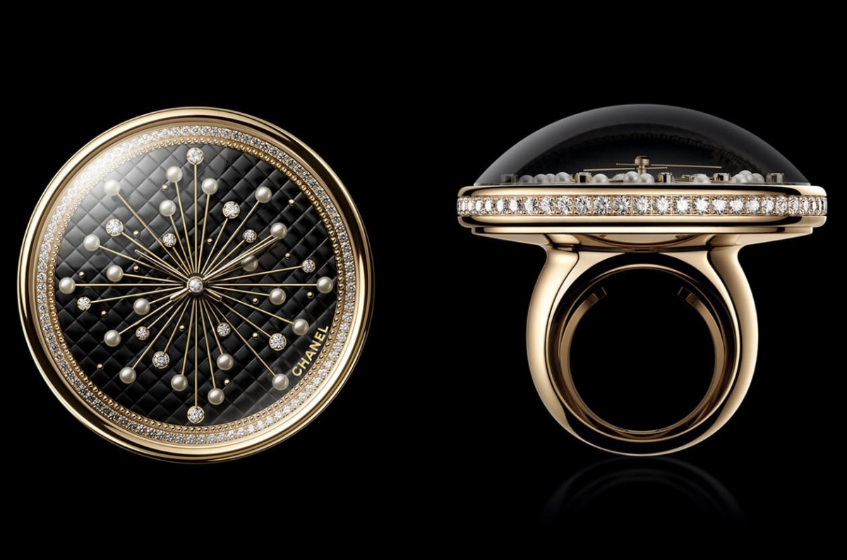 2024年Mademoiselle Privé Pincushion Couture系列完全打破針墊戴在手腕的傳統形式,不僅延伸出長項鍊錶,亦增添了體積更迷你的戒指錶讓人感到耳目一新。香奈兒於巴黎珠寶工坊製作出黃金戒指主體,同時品牌製錶廠則是開發出錶徑縮小至40mm的針墊型錶徑,兩者經過縝密設計合而為一,從外觀上看不出任何固定裝置,彷彿一體成型般呈現出流線俐落造型。由於Mademoiselle Privé Pincushion Couture戒指錶明顯體積縮小,因此錶側改為鑲嵌單排鑽石,不過面盤外圍的鑽石與黃金珠串皆完整保留,同時仍舊以黃銅製作狀似菱格紋的造型,並於其上點綴匯聚於面盤軸心的大量「珠針」,由於面盤面積較小,珠針頂部珍珠與鑽石的比例看起來也相對較大,另外品牌還特別在4~5點方向印上金色的"CHANEL"標誌,具體而微地展現錶款巧妙創意正是源自高級訂製服相關元素。